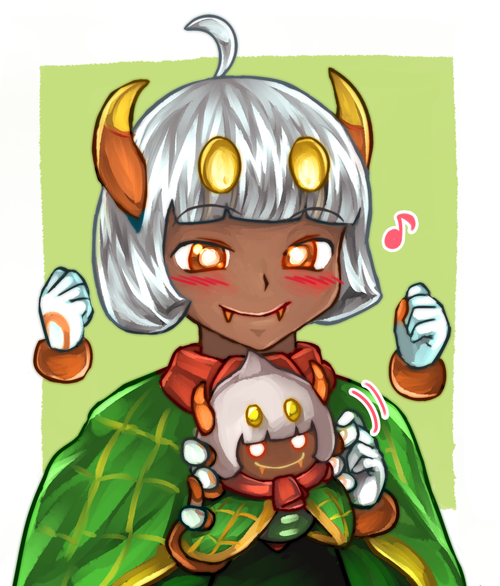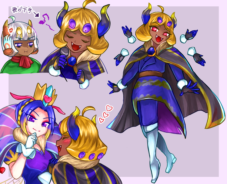 ダランザは、これは擬人化に限った話じゃないんですけど、タランザよりちょっと幼い感じに描いてます。黒い鏡から生まれたてほやほや!というプレミア感を大事にしたい(←最低)という他にも理由がありまして、なんつうかダランザは、タランザが「女王様とその部下」な関係性に埋めて隠してしまったプリミティブな恋心を慇懃無礼に表現してそうなイメージがあるんですよね。女王様は面白がってるんだけどその横で本体が羞恥心で悶え死にそうになってるかんじ。この解釈を乗せた漫画を思いついてたんですが、この1年間で人体描かなさすぎてふつうの人間の出てくる漫画の描き方を忘れたのでお蔵入りしました。ごめーん。