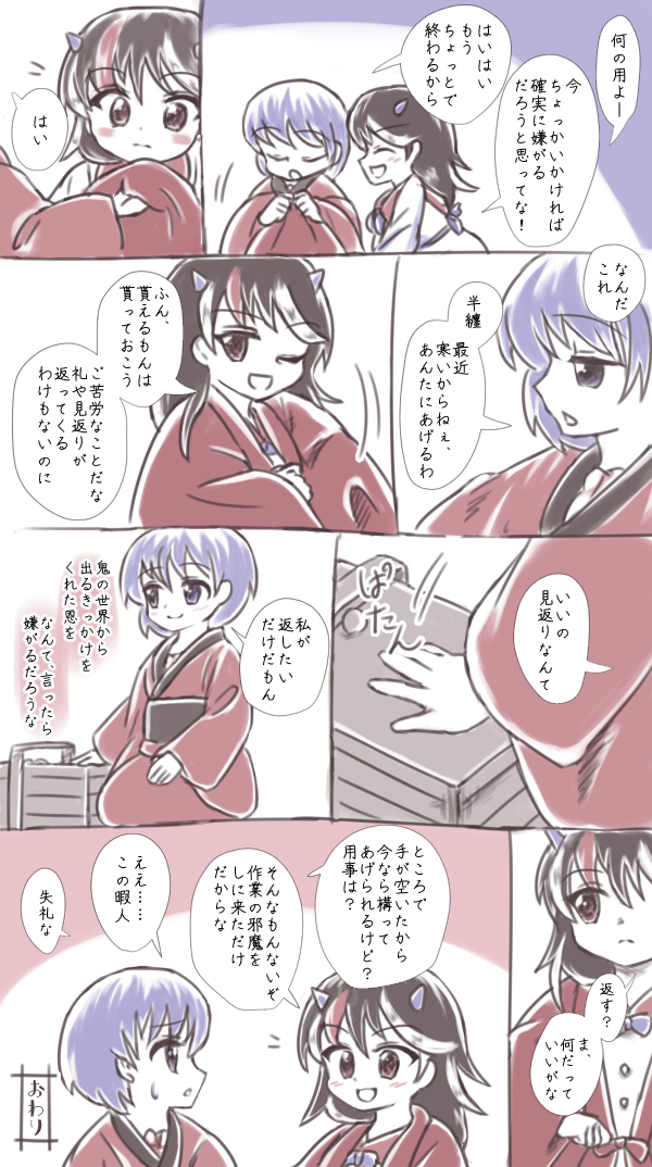 針妙丸は何だかんだ言って恩はちゃんと返す子だよなあとか、なんかそんな感じのアレをまんがに取り入れたりしてます。あの子の裁縫スキルはつよい。
