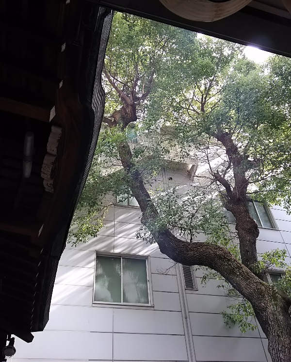 境内から見上げると、樹齢130年(だっけ?)のご神木がいいかんじにモサっていました。