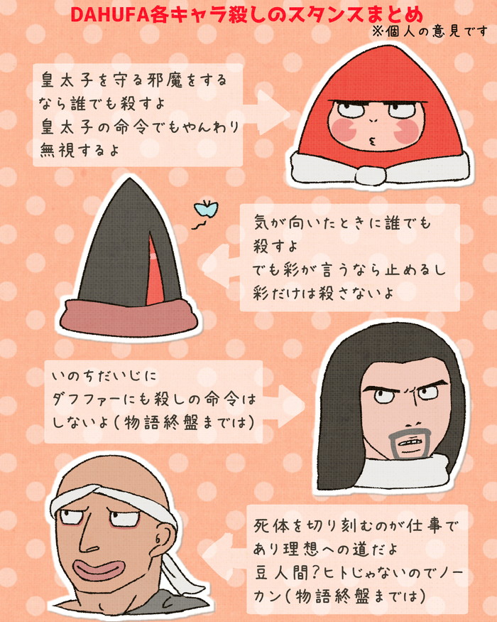 前の記事で書いた、各キャラの殺しについてのスタンスをまとめてみた。私個人の意見ですけども。