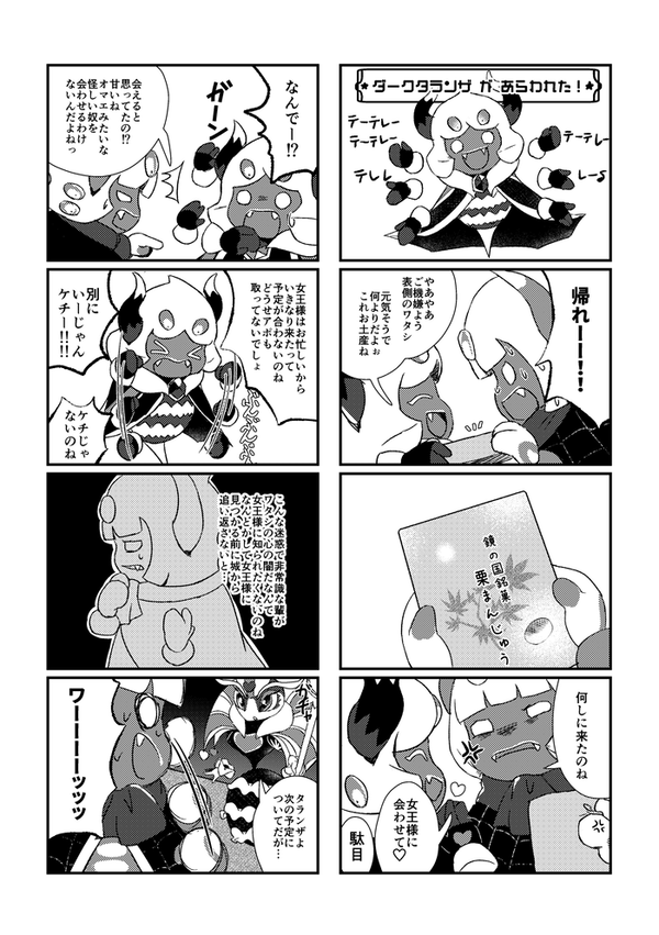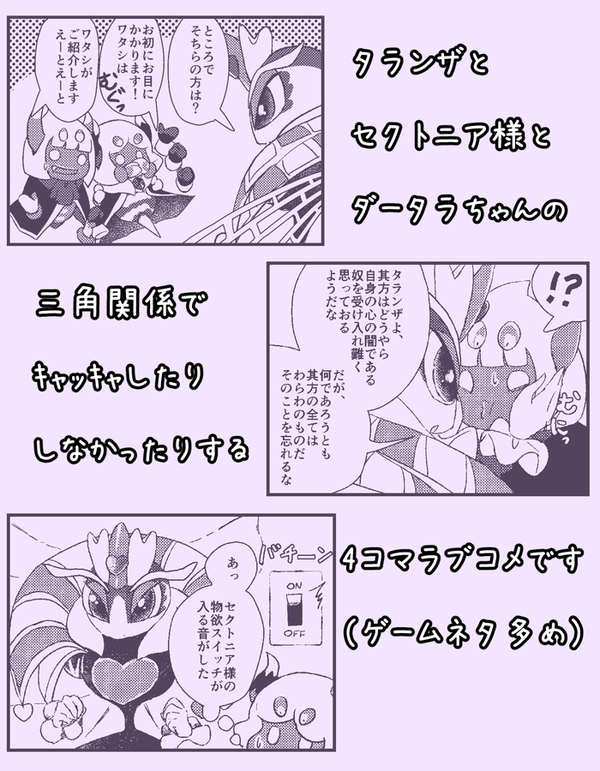 今回の本を描くにあたって地味に悩んだのはダークタランザちゃん周りの設定です。曖昧にできるところはそうしましたが、明かされてない設定がとにかく多い子なので……。とりあえず彼の出自は、今回は鏡の国ということにしましたけど、あくまで暫定的なものだし公式ではたぶん違うんだろうなぁと思いつつそういう設定にしています。これから公式で違う設定が出たとしても、出る前に描いたんだから反映されてなくて当たり前ですしね。